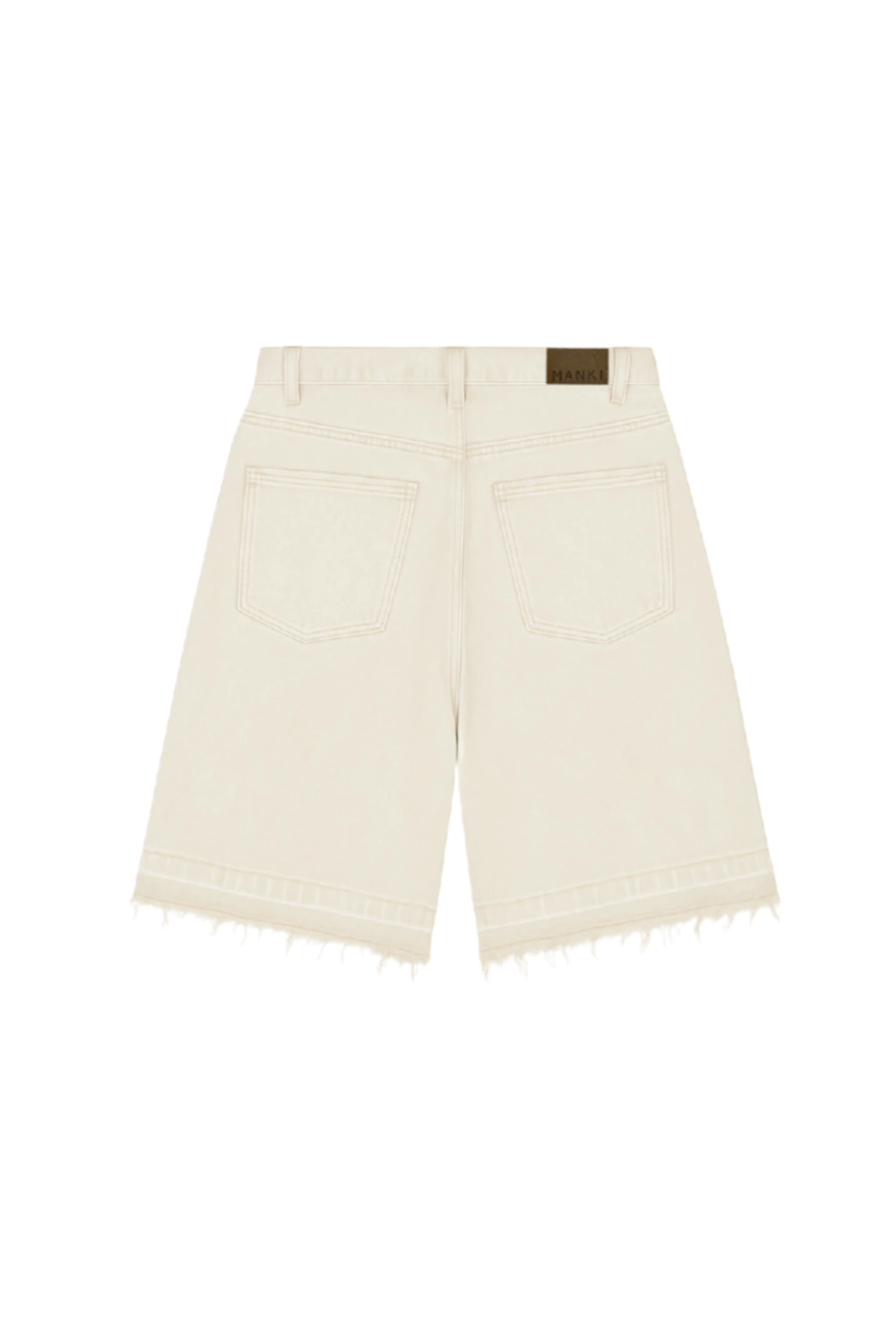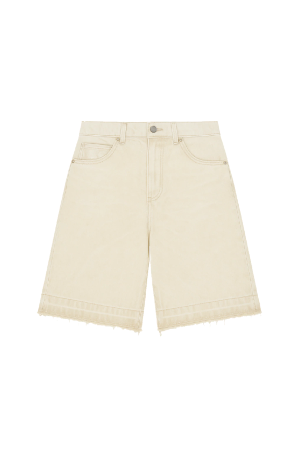 Bermuda de gabardina de calce baggy. Con bolsillos delanteros y traseros, con etiqueta de marca. Detalle de desgaste en el ruedo y terminaciones desflecadas.