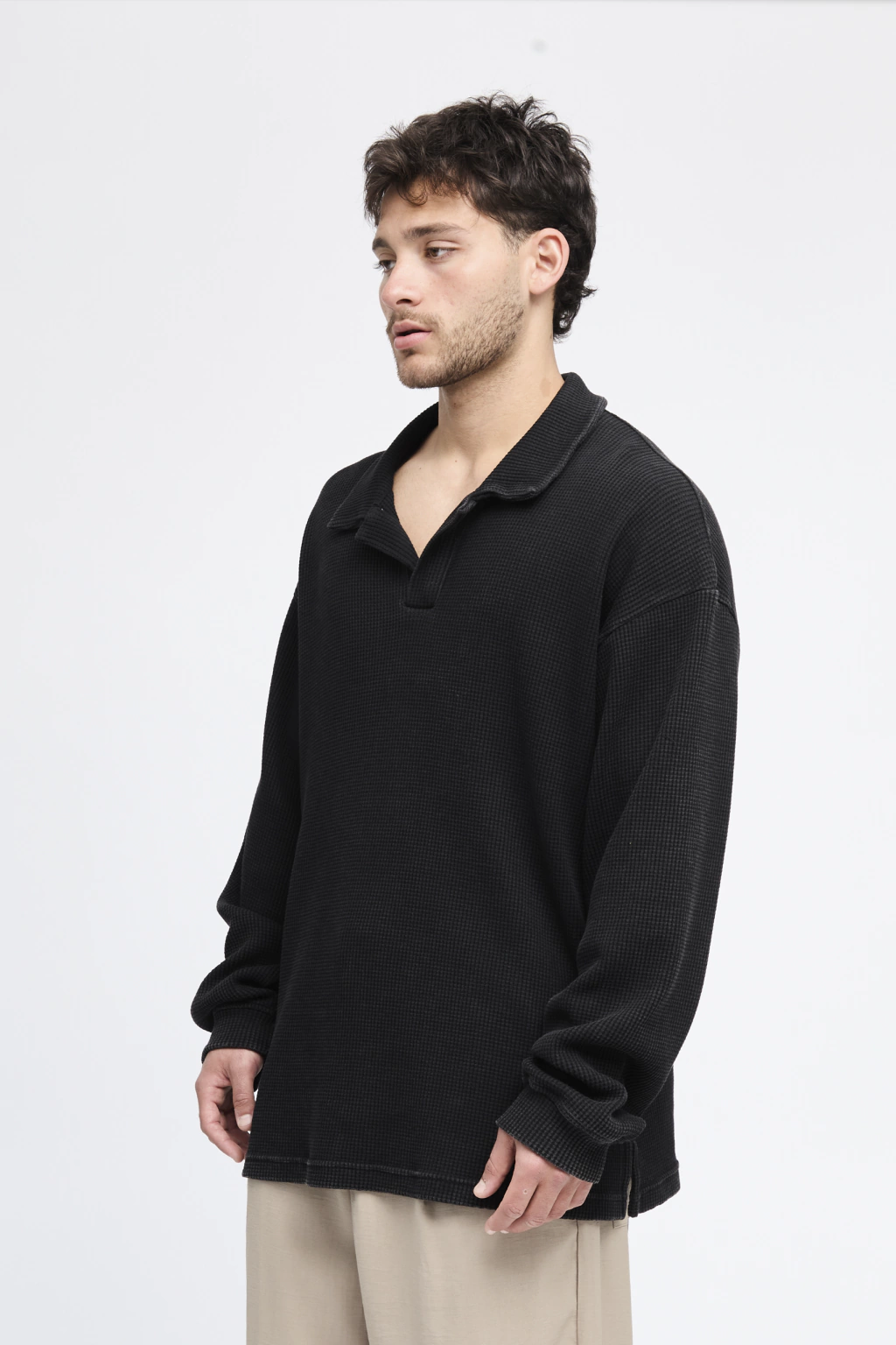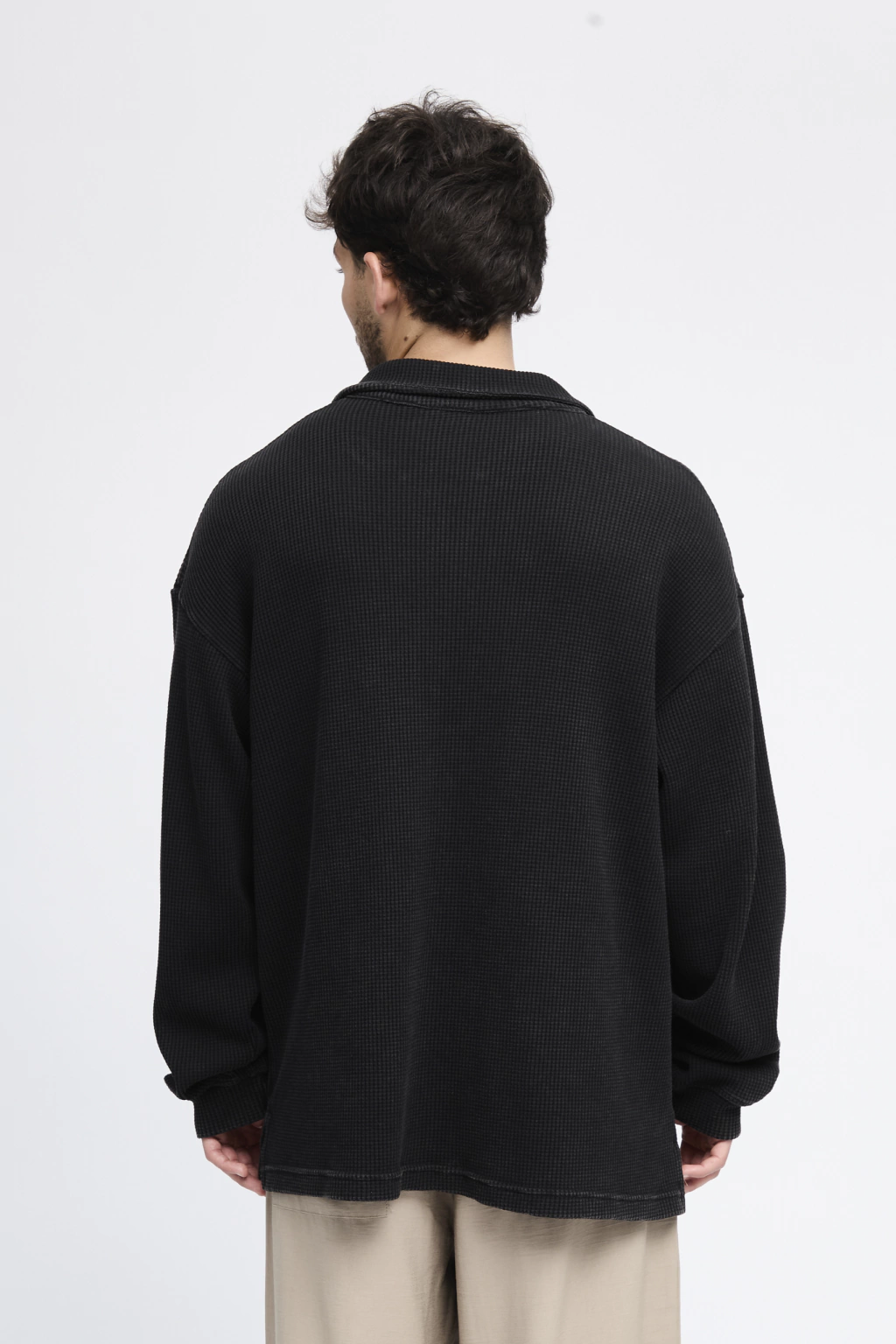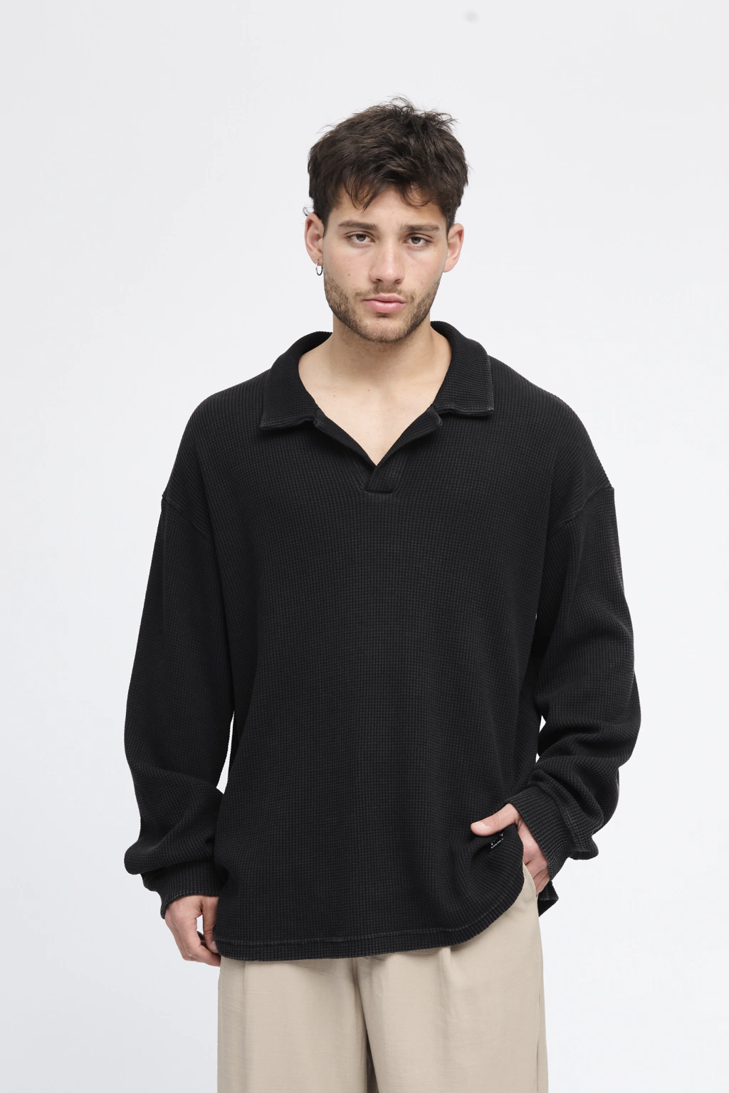 Polo manga larga en tejido waffle. Cuenta con cuello, cartera y puños confeccionados en el mismo textil. Se realizo un lavado lasér para generar un defecto gastado.