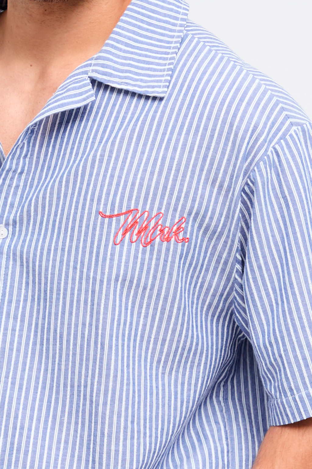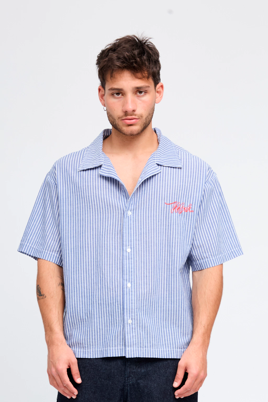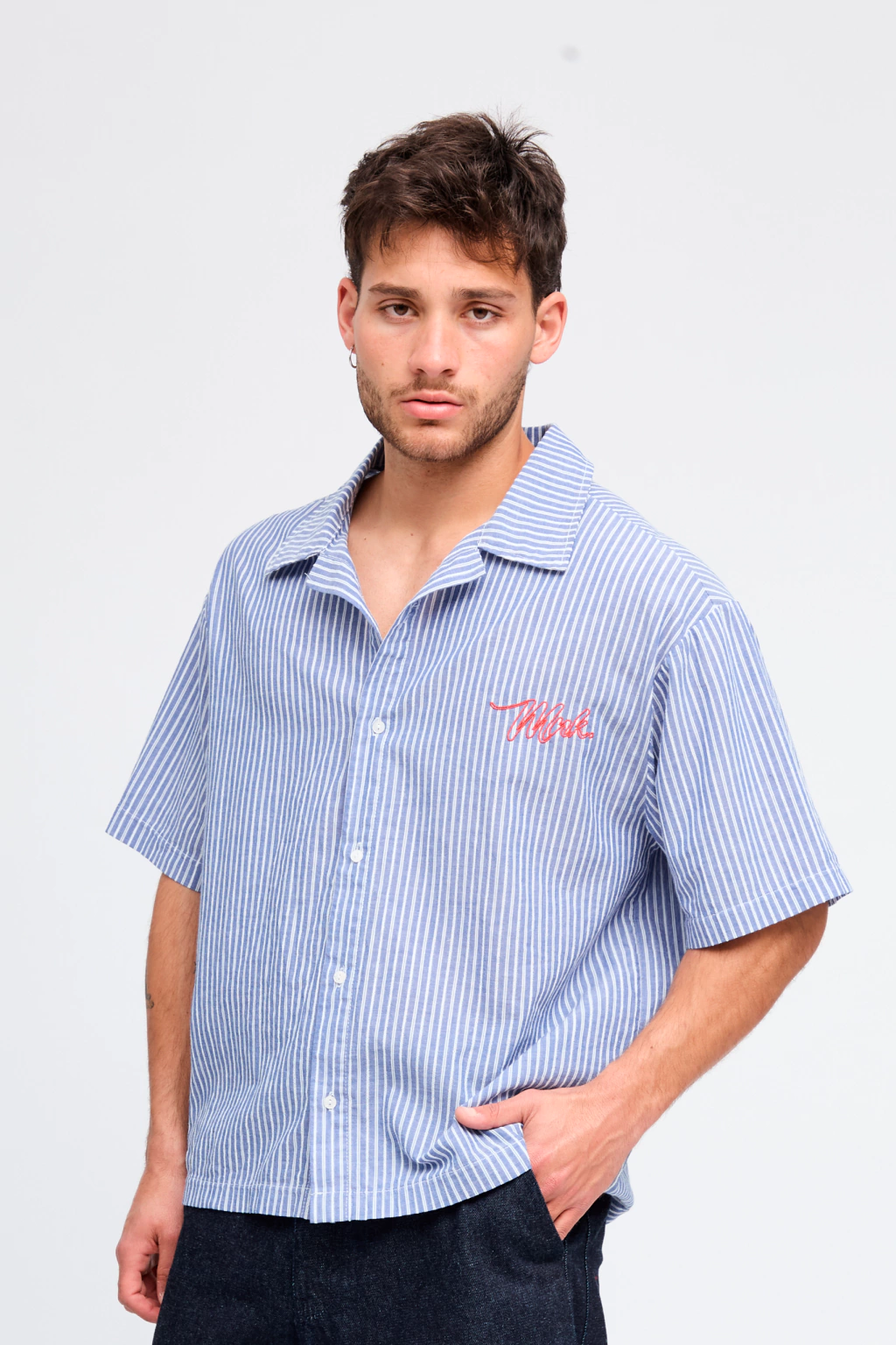 Camisa rayada manga corta de calce boxy. Presenta bordado en color rojo en el delantero y en la espalda.