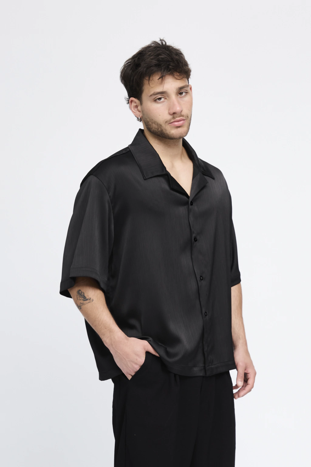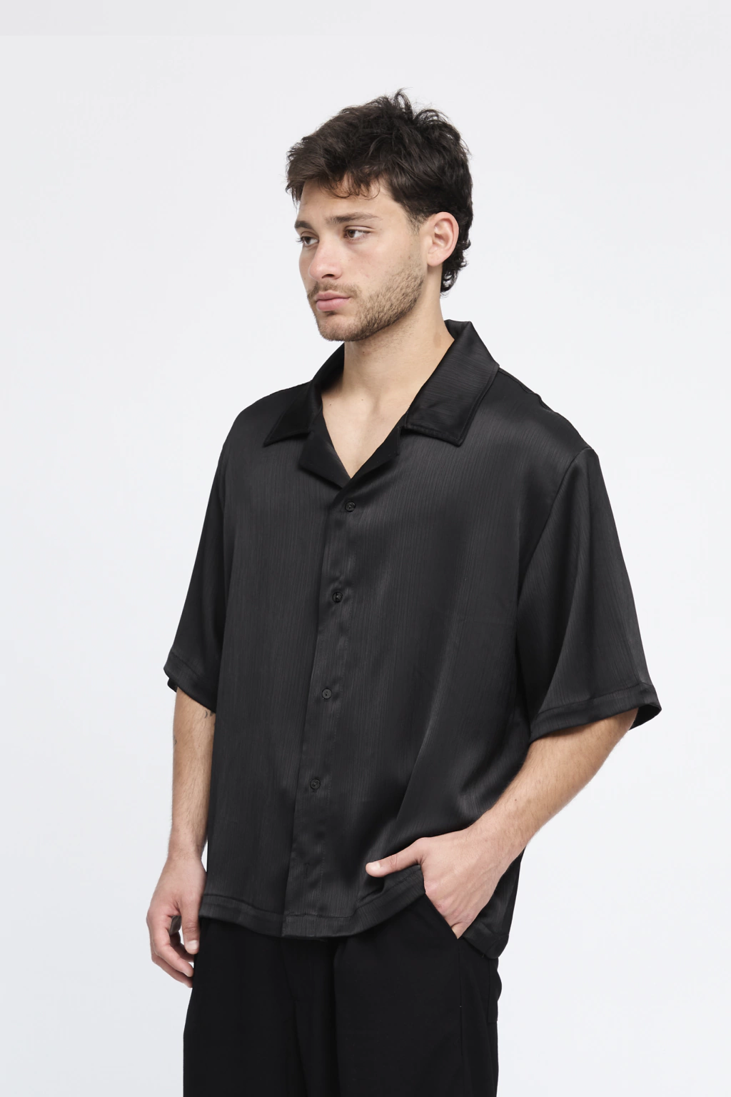Camisa boxy manga corta, confeccionada en un textil fresco, de textura rugosa y un leve brillo. Cuenta con cinco botones a tono.