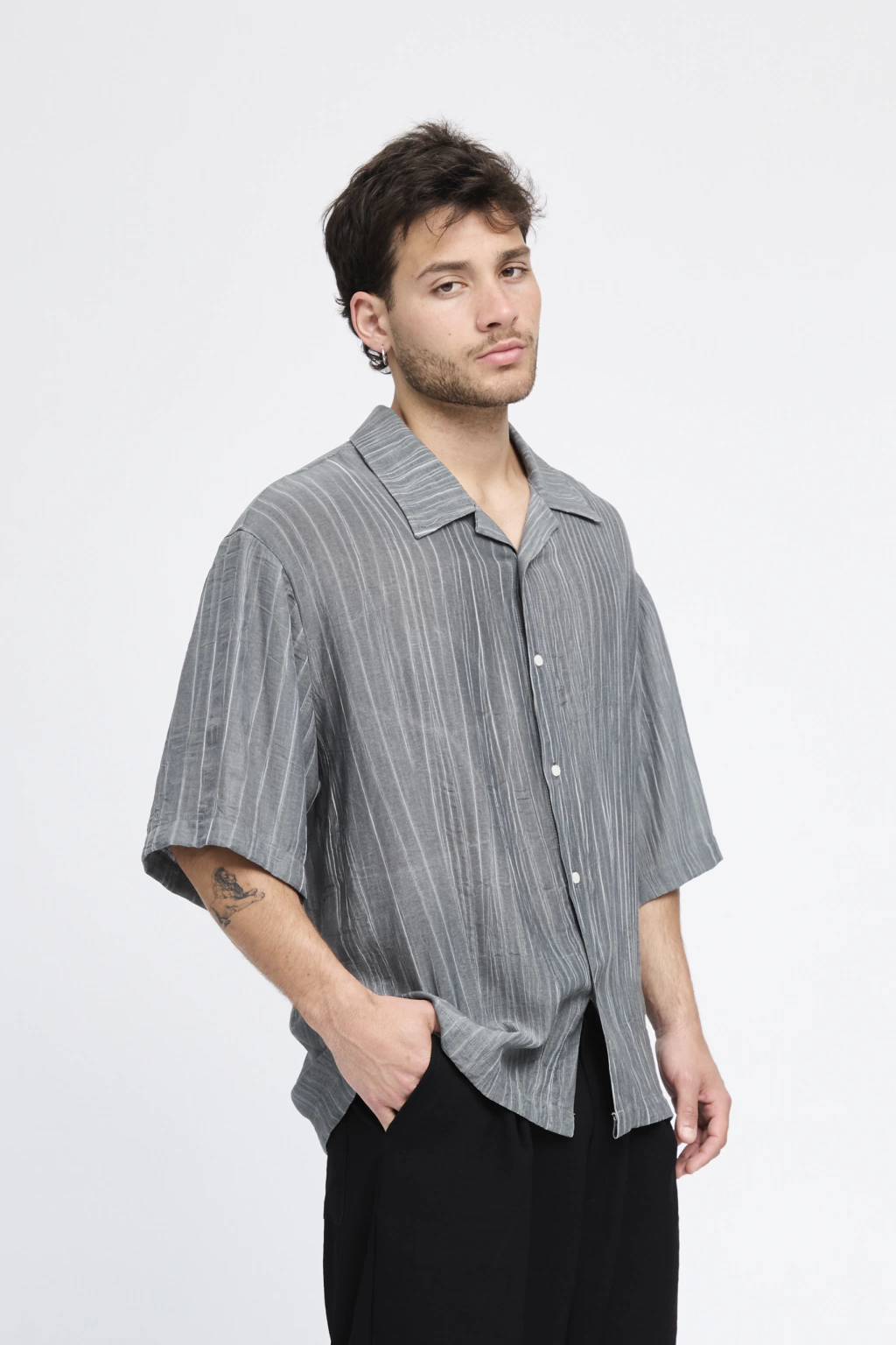 Camisa de manga corta, de calce boxy. Confeccionada en tela liviana y con textura, generando un efecto rayado.