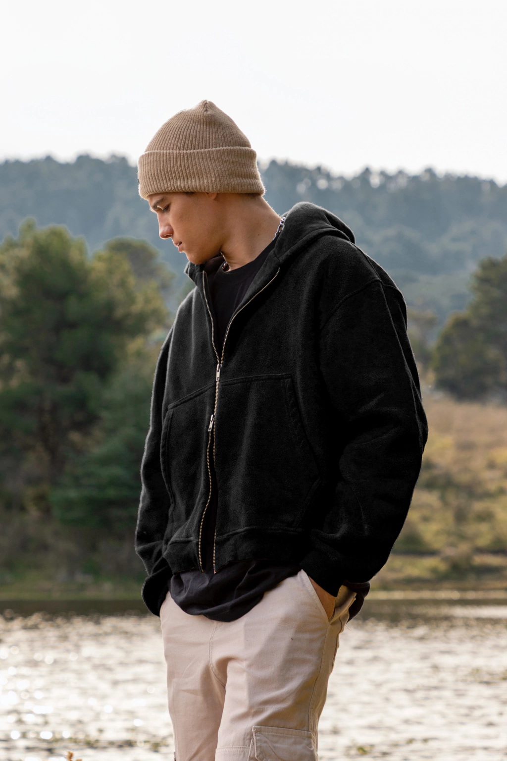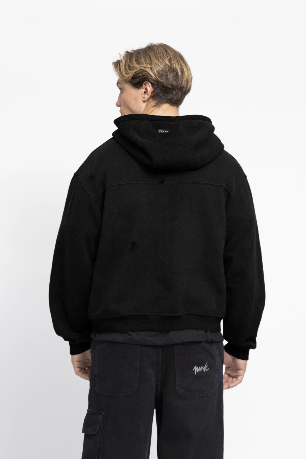 Campera de frisa con calce boxy y recortes que aportan comodidad y estilo. Cuenta con un cierre doble carril, capucha y bolsillo canguro.