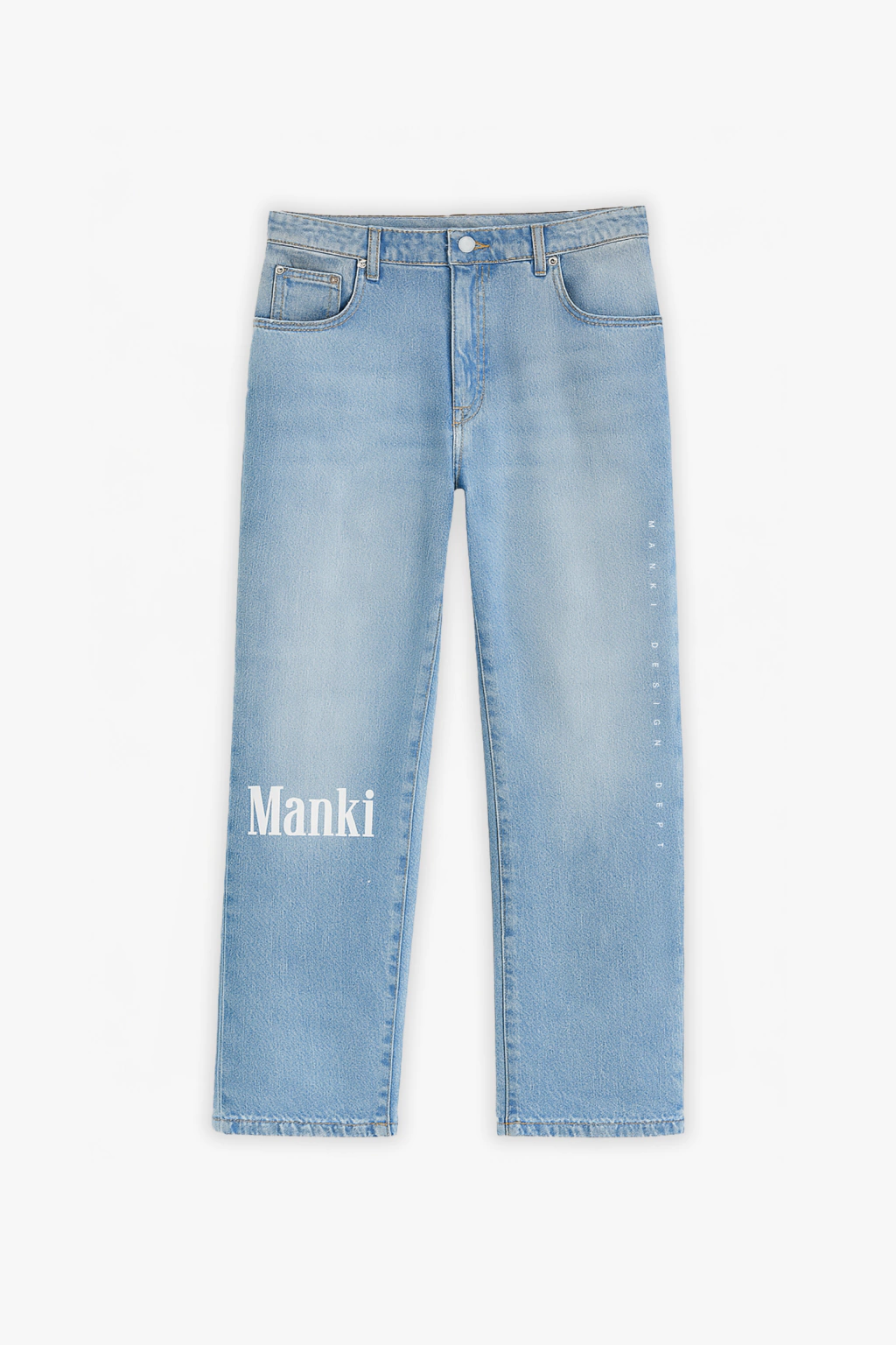 Se realizo un leve localizado y un sutil marcado de costuras. Tambien se le realizó estampas en el bolsillo trasero y en las piernas.