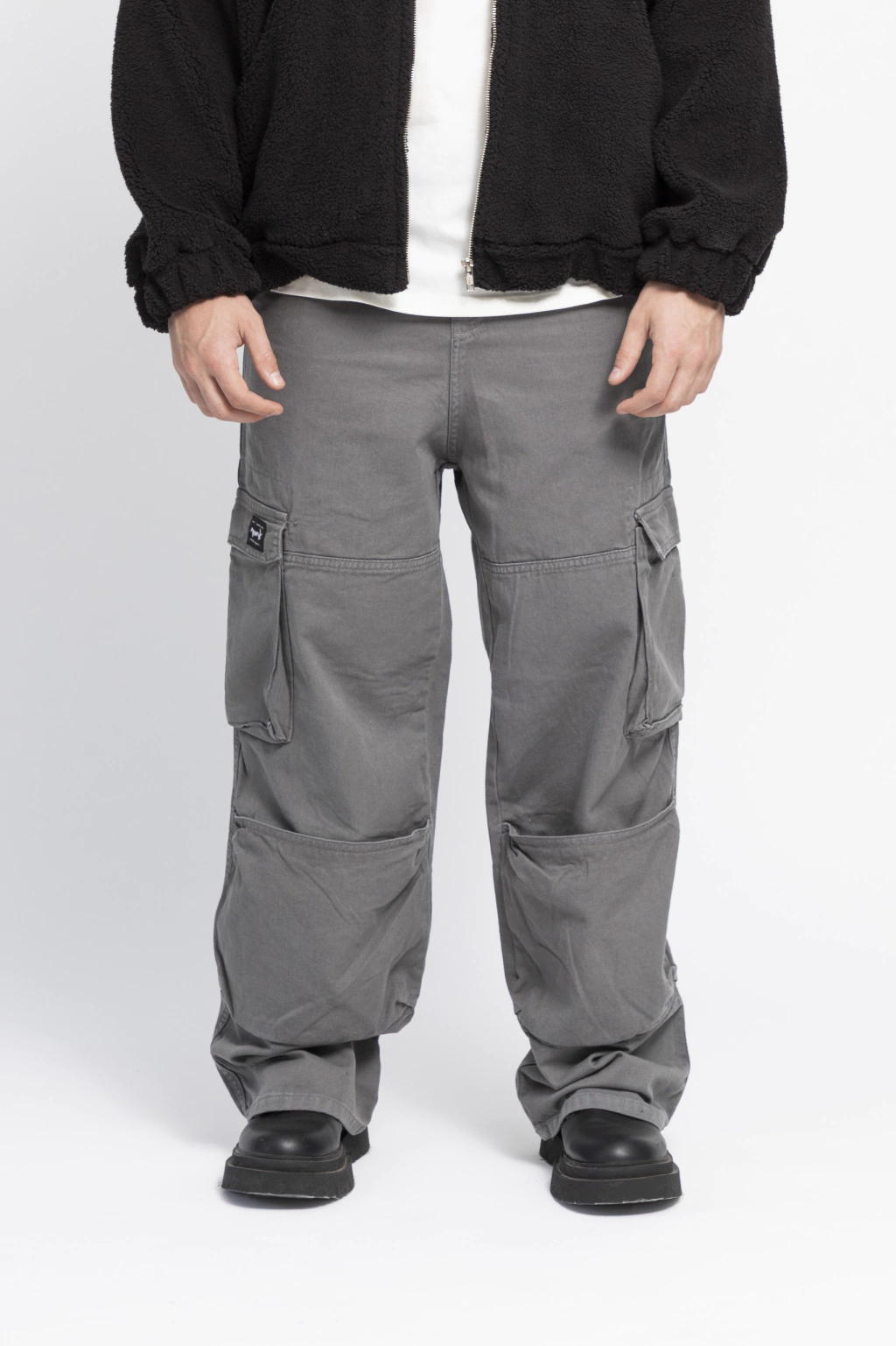 Jean cargo recto gris. Cuenta con dos bolsillos amplios tipo cargo en los laterales, y dos bolsillos traseros con recortes. Tiene dos bolsillos en la parte inferior Cierre y botón metálico.