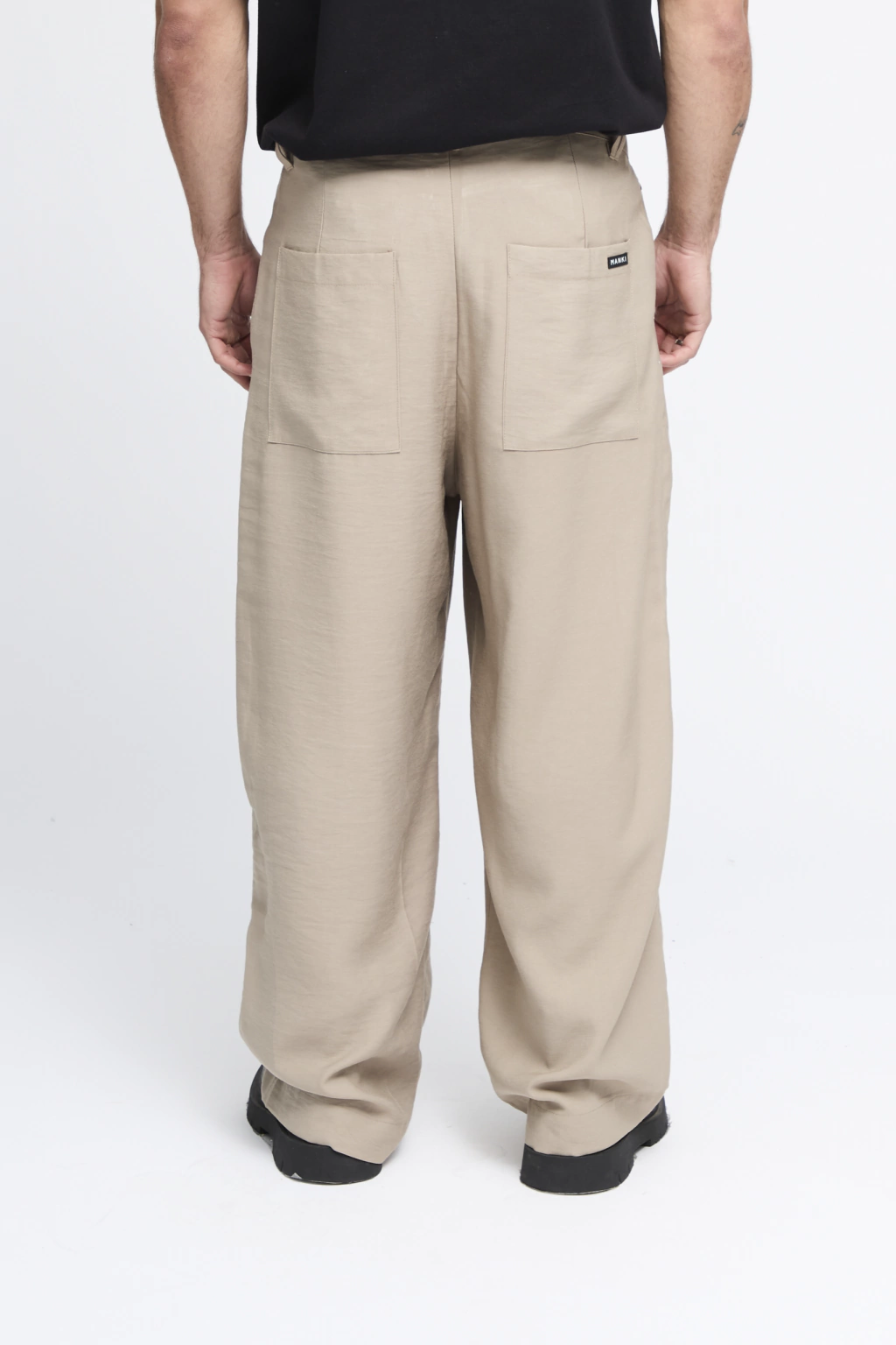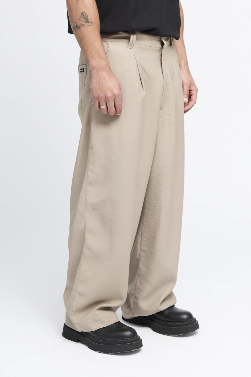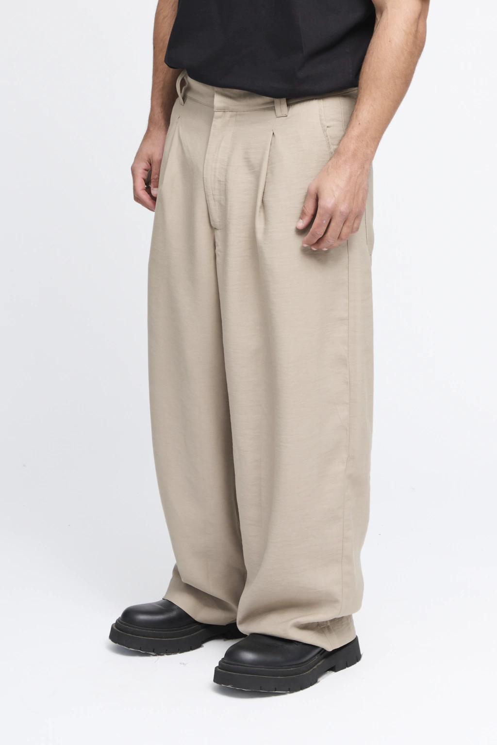 Pantalón sastrero de calce baggy con pinzas. Cuenta con cierre y dos ganchos sastreros, dos bolsillos traseros y doble presillas pára un ajuste cómodo.