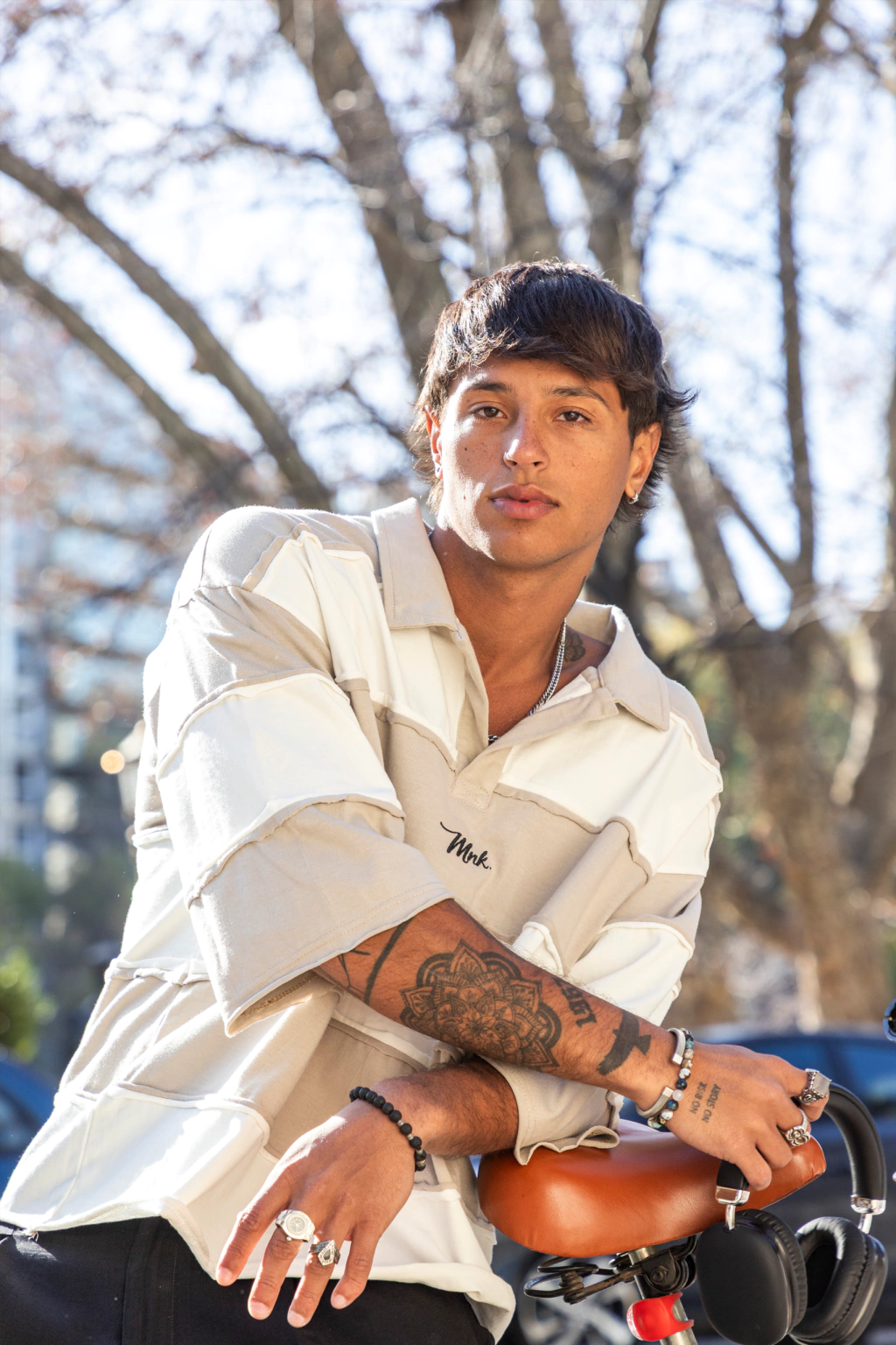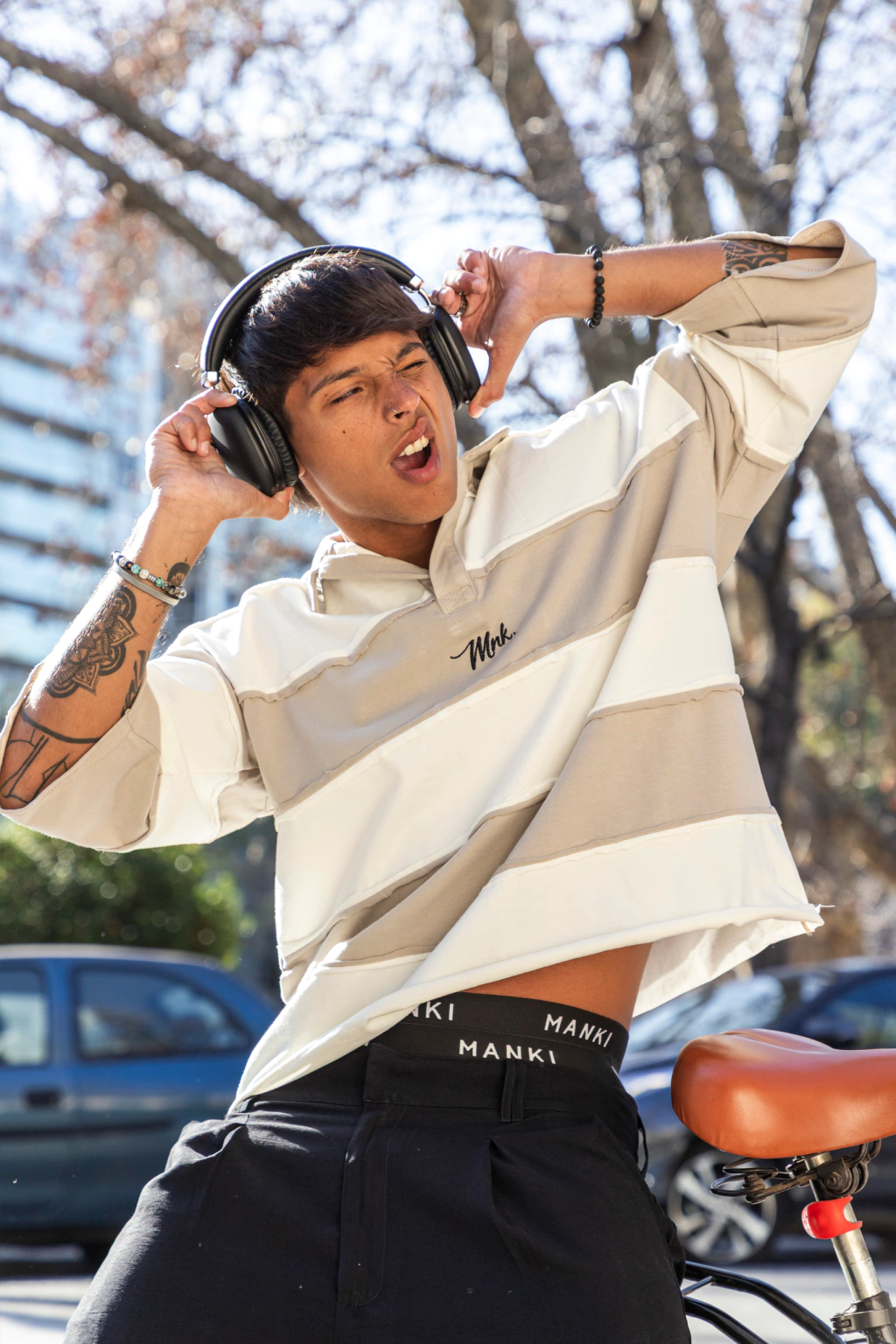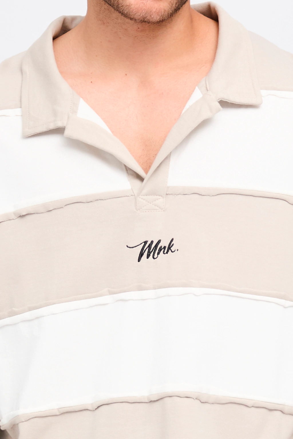Polo manga corta de algodón. Cuenta con recortes horizontales, generando un efecto rayado artesanal único. También tiene un bodado en el frente a contra tono.